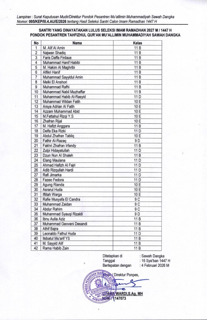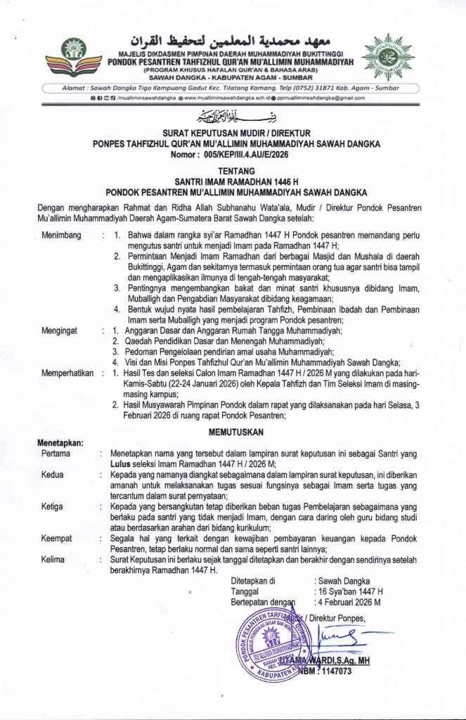 Sawah Dangka — Pondok Pesantren Tahfizhul Qur’an Mu’allimin Muhammadiyah Sawah Dangka kembali menunjukkan komitmennya dalam mencetak kader-kader da’i dan imam yang siap terjun ke tengah masyarakat. Sebanyak 42 santri resmi dilepas untuk mengemban amanah sebagai Imam Ramadhan 1447 Hijriah di berbagai masjid dan mushalla.